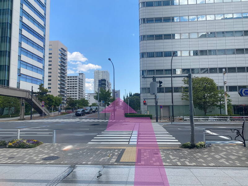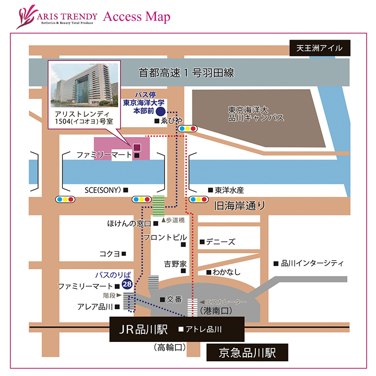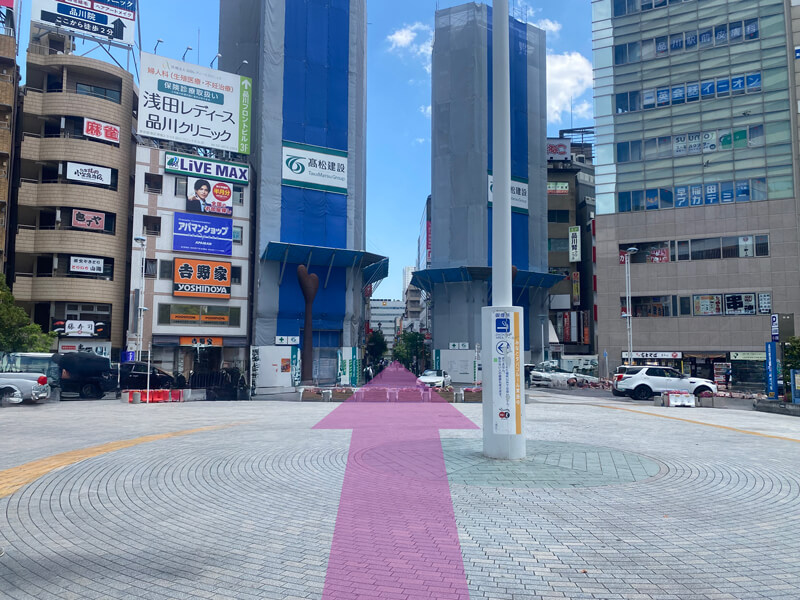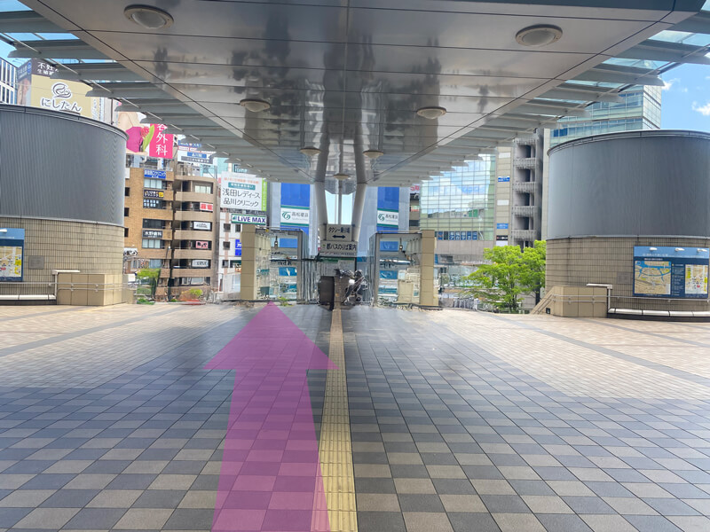(1)JR品川駅港南口(地上2階)を出て、左斜め方向(アレア品川ビル方面)に進みます。