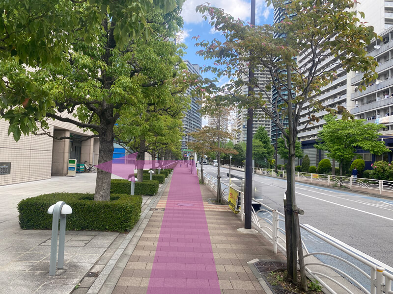 (2)道路の上を渡り、ビル(アレア品川)に入る手前の左手の階段(a港南一丁目・芝浦中央公園 バスのりばの看板があります)を下ります。